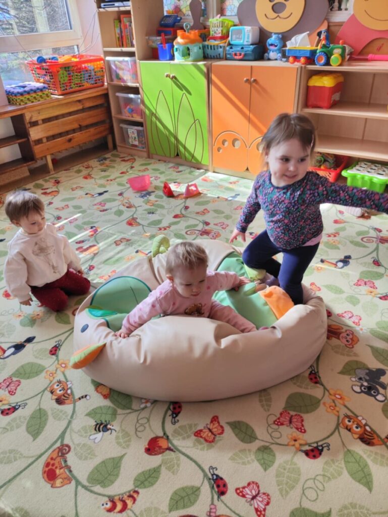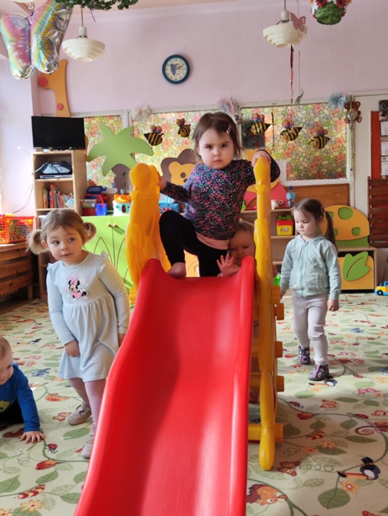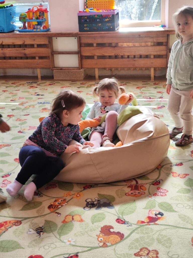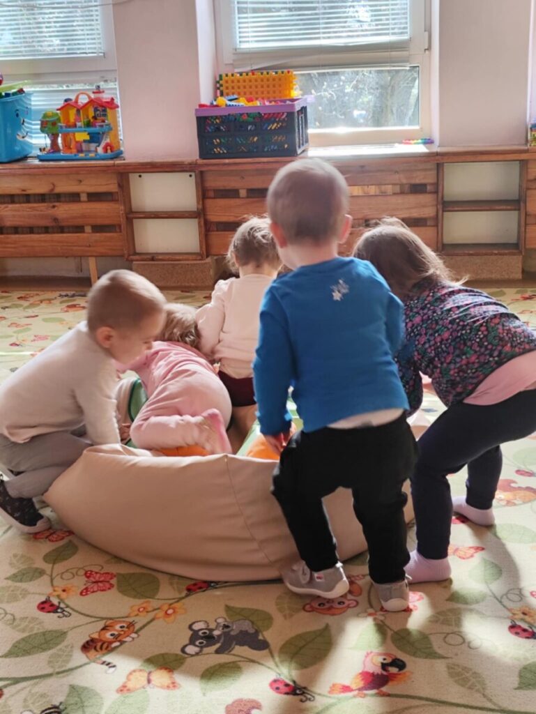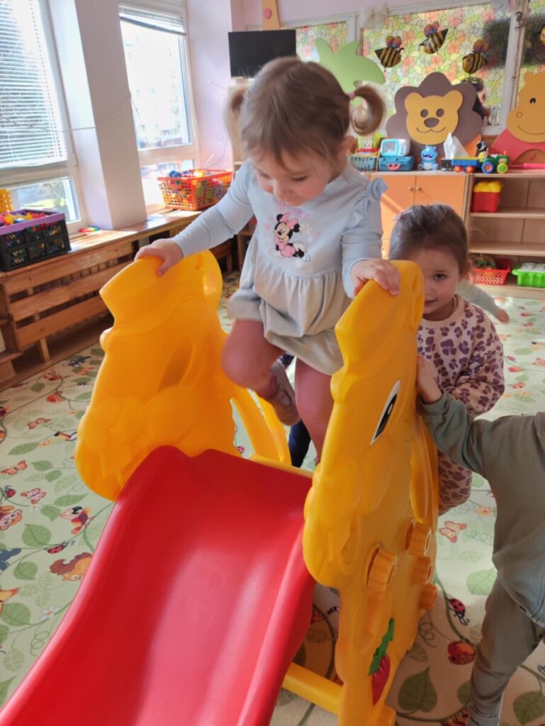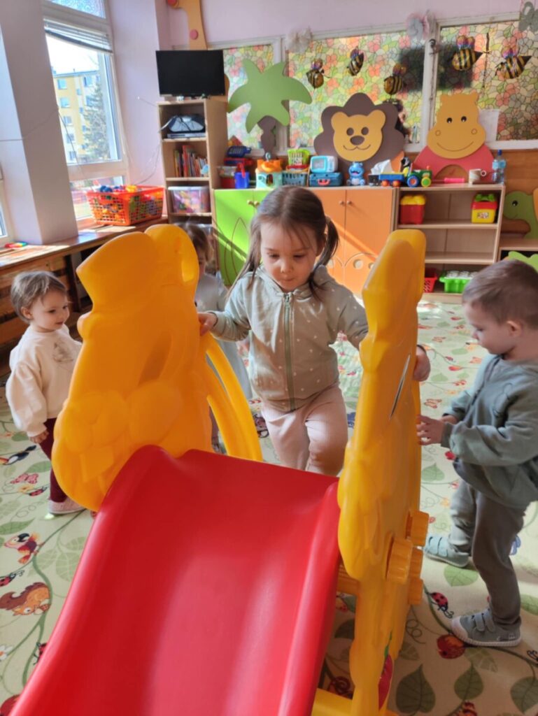 Zjeżdżalnia- maluchy wspinają się na po schodach, siadają i zjeżdżają, ćwicząc koordynację ruchową, równowagę. Zabawa na poduszkach – skakanie, turlanie się i chodzenie po miękkich poduszkach rozwija zmysł równowagi, wzmacnia mięśnie i daje radość z ruchu.
