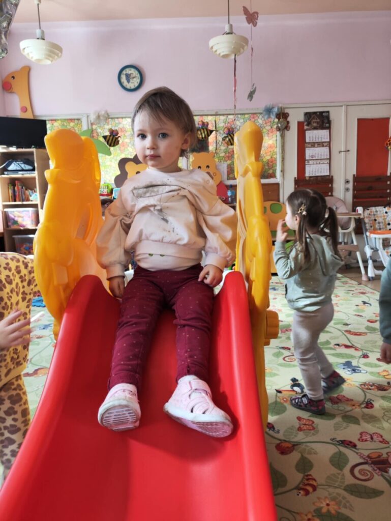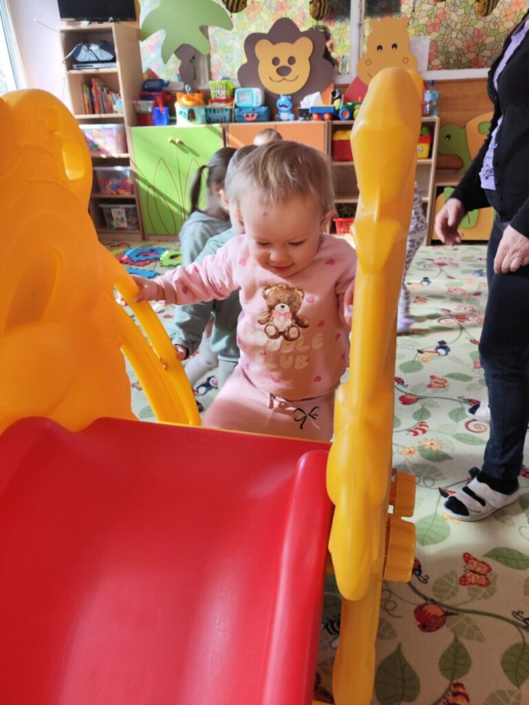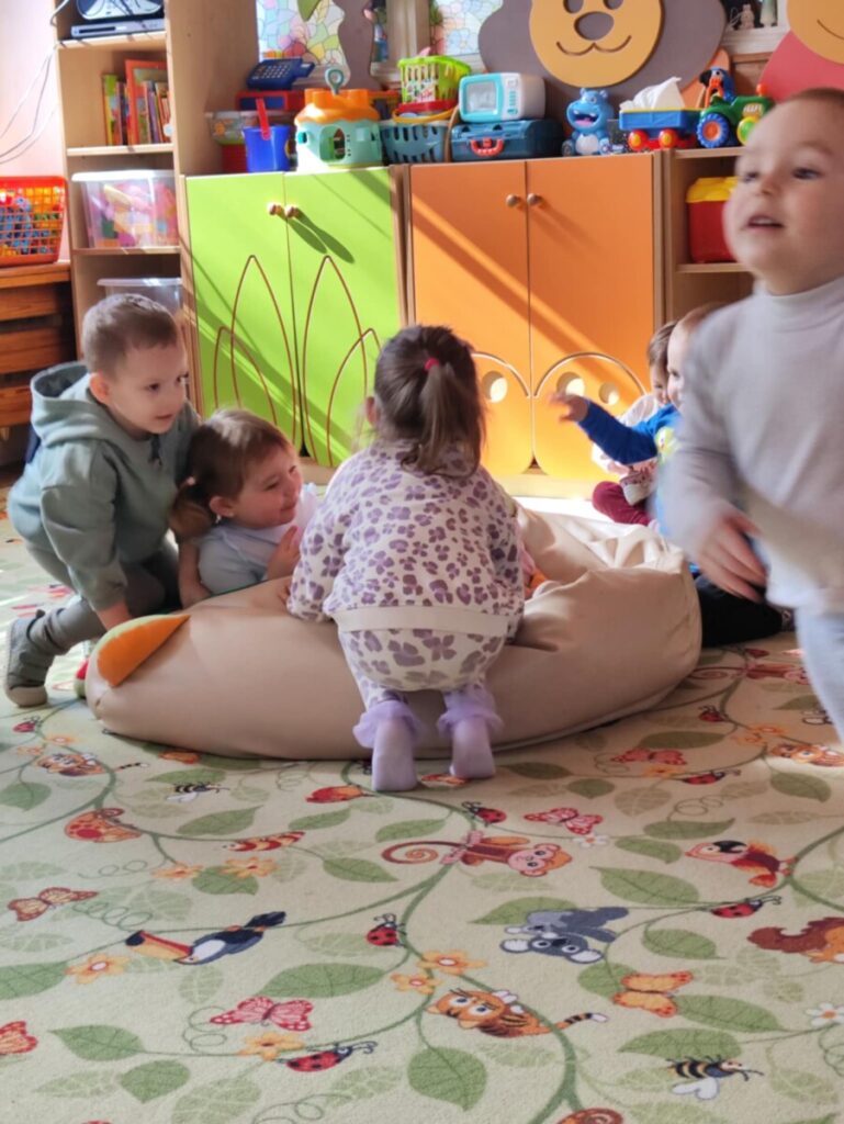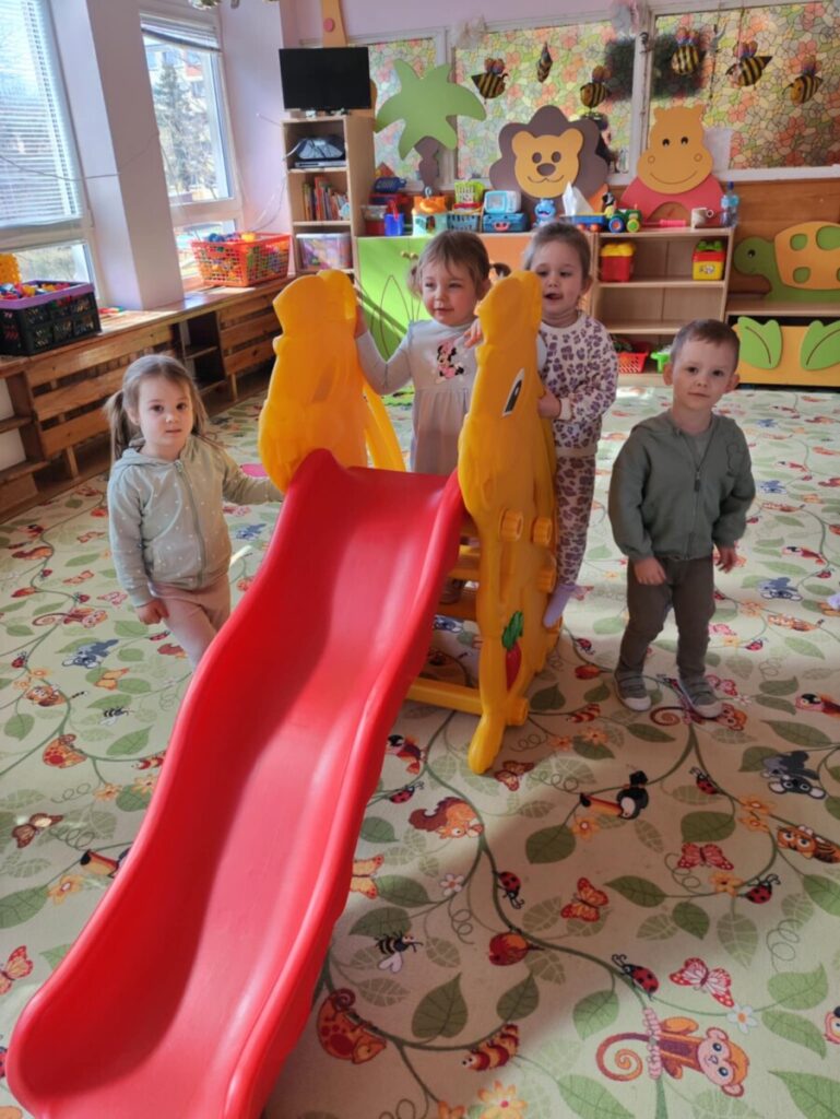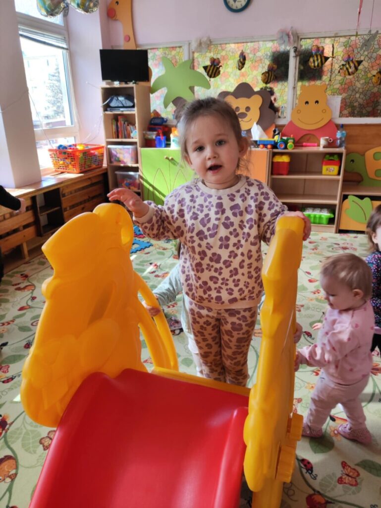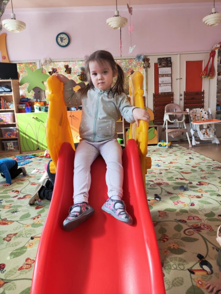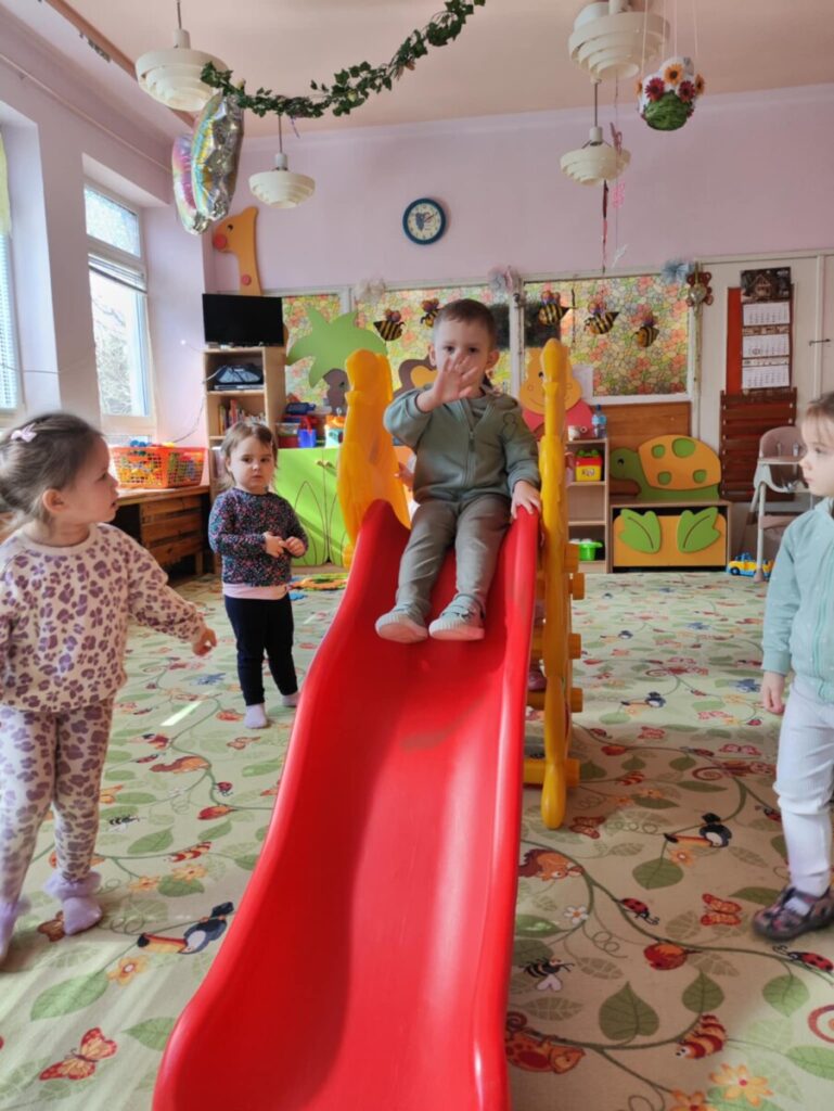 Zjeżdżalnia- maluchy wspinają się na po schodach, siadają i zjeżdżają, ćwicząc koordynację ruchową, równowagę. Zabawa na poduszkach – skakanie, turlanie się i chodzenie po miękkich poduszkach rozwija zmysł równowagi, wzmacnia mięśnie i daje radość z ruchu.