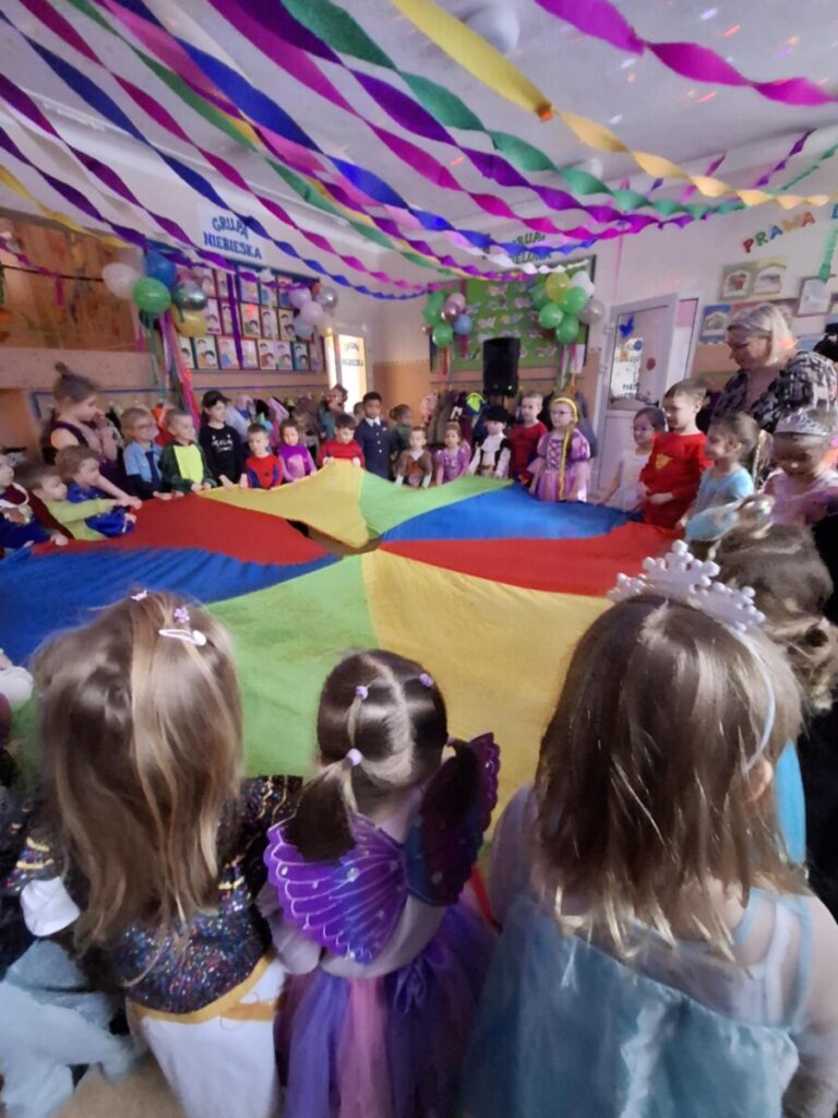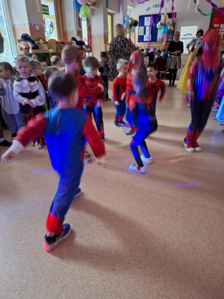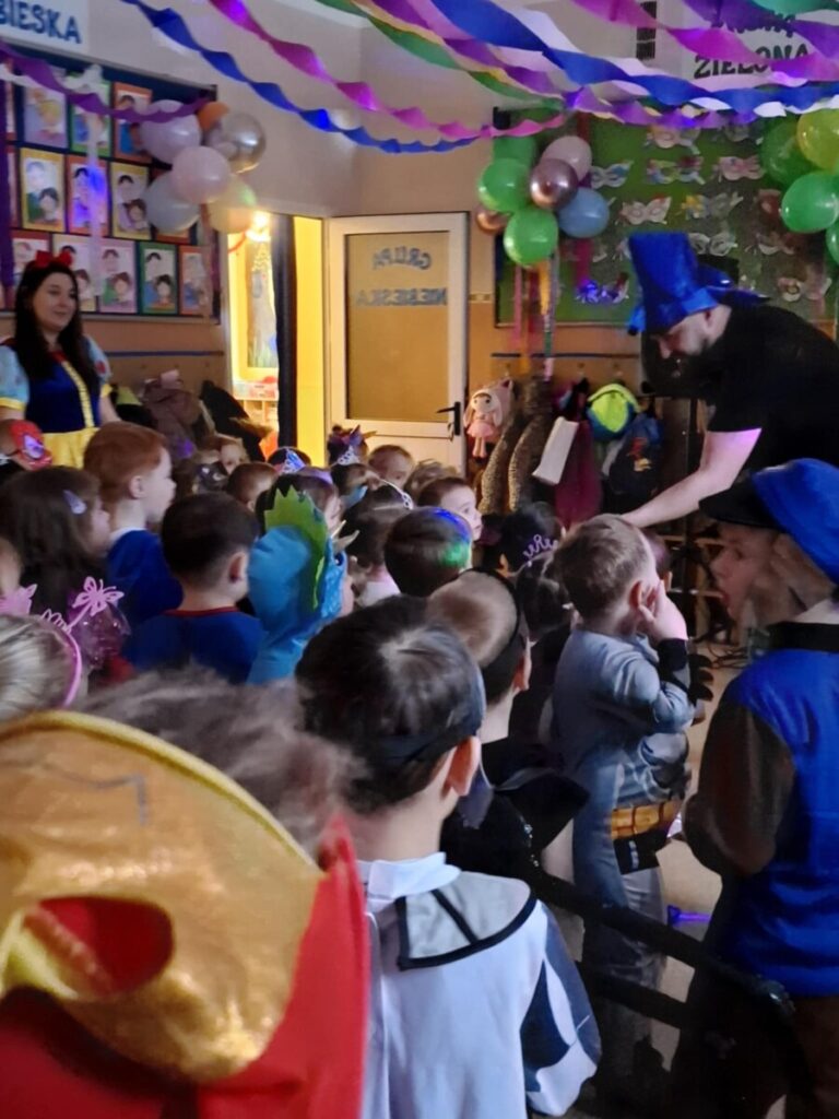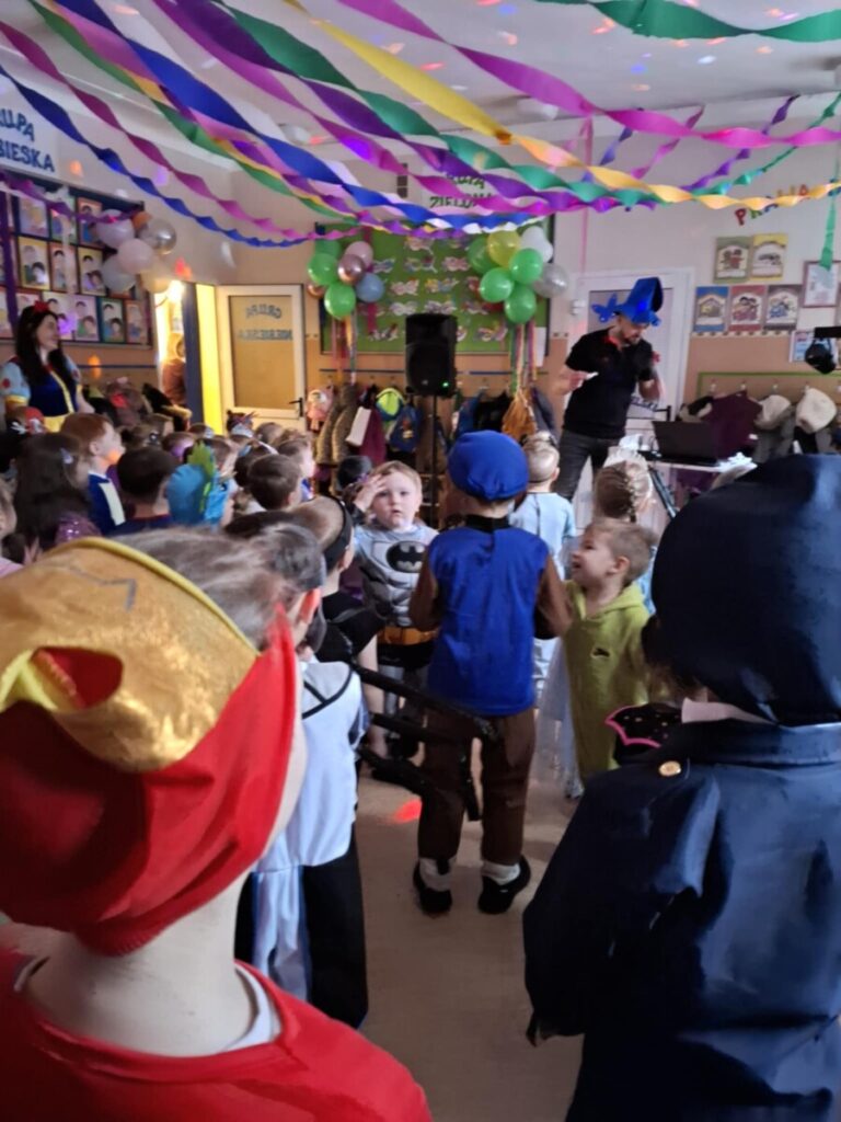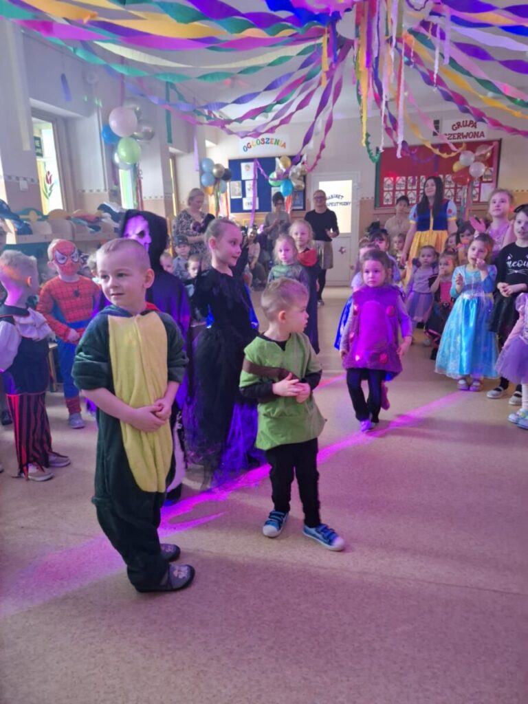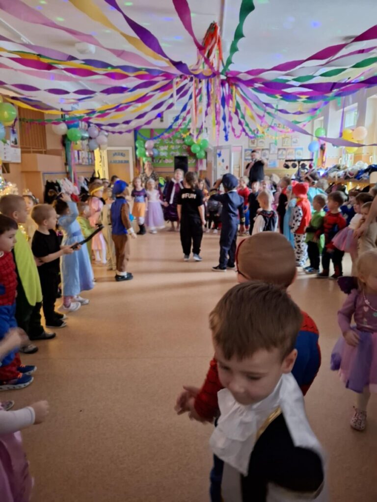 Bal Karnawałowy w przedszkolu. Kolorowe stroje, radosna muzyka i mnóstwo uśmiechów. Dzieci bawiły się wspaniale, a ten dzień na długo pozostanie w naszej pamięci.