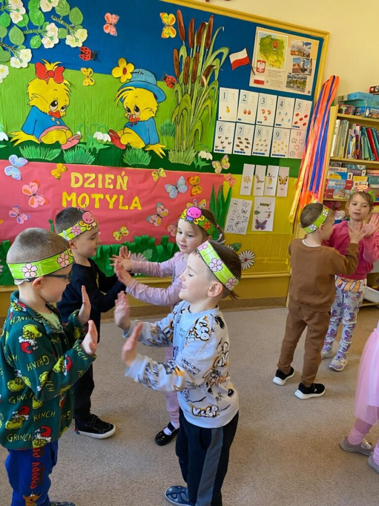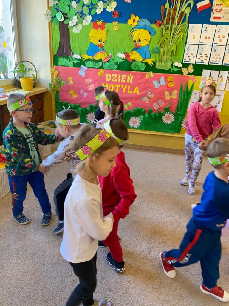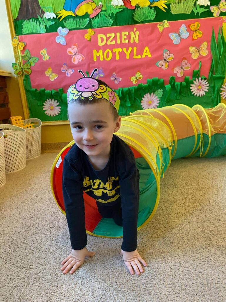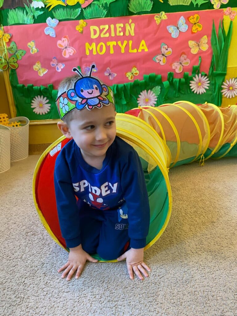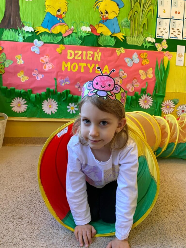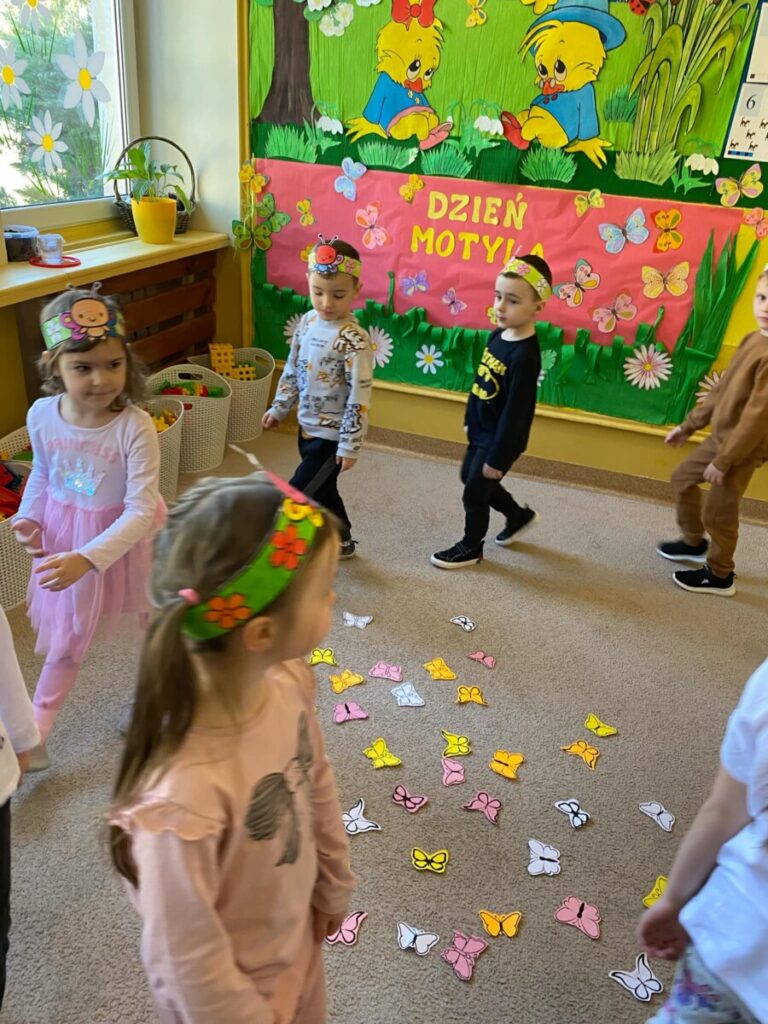 w grupie „Słoneczka”- Fruwający kwiatuszek, który pląsa po łące jak duszek. Motyle są zachwycające i niezwykle pożyteczne. Dzieci poznały cykl życiowy motyla, jego budowę oraz niektóre gatunki i ich rodziny. Zabawa była iście wiosenna 🦋