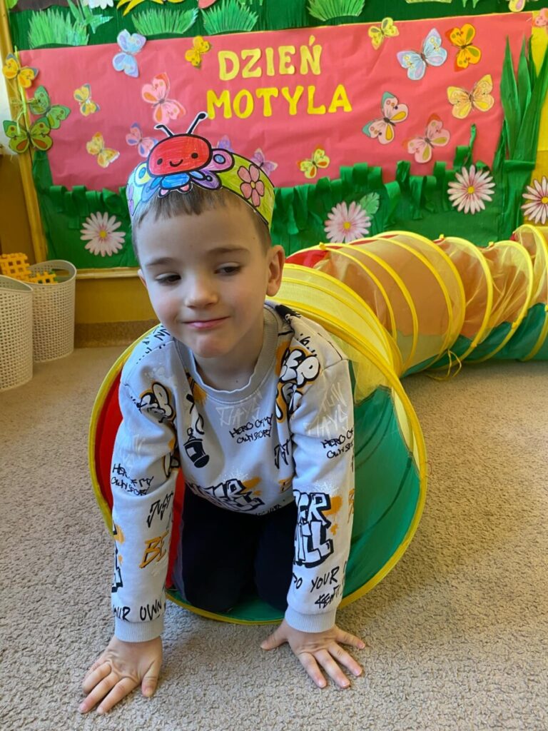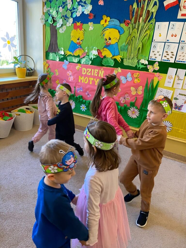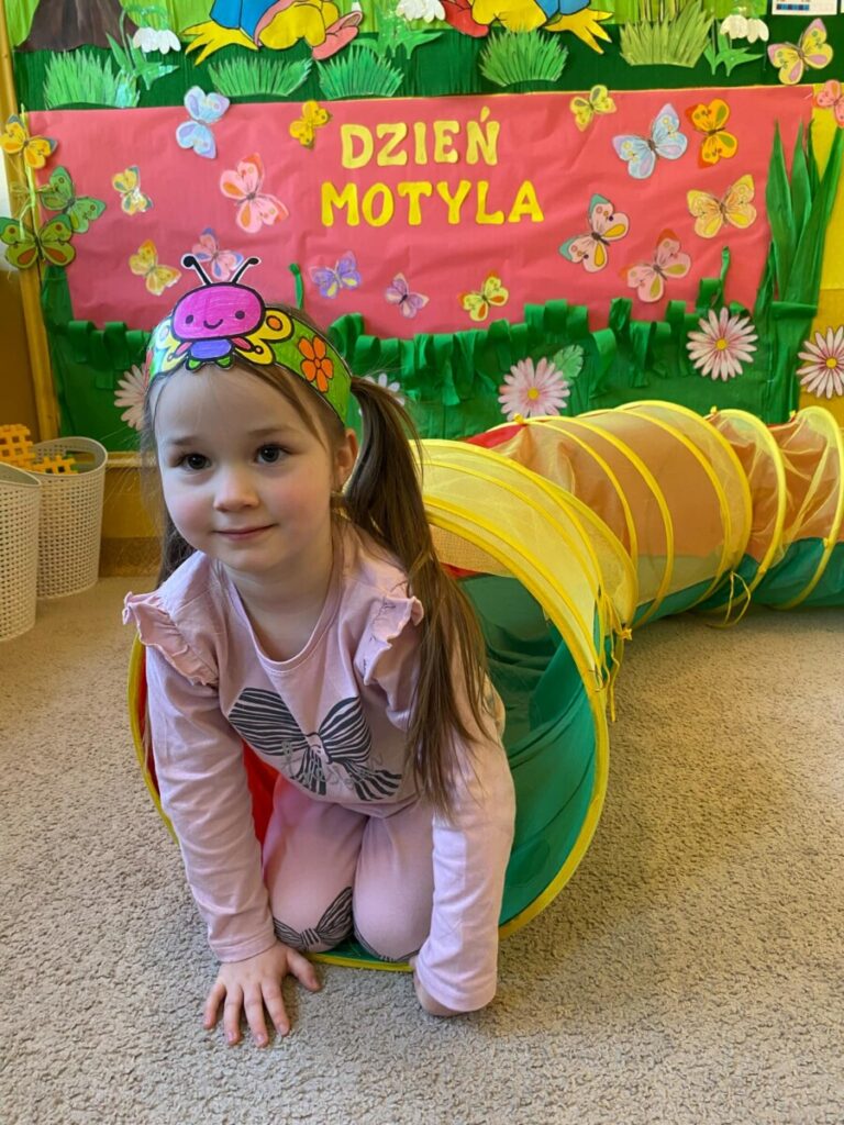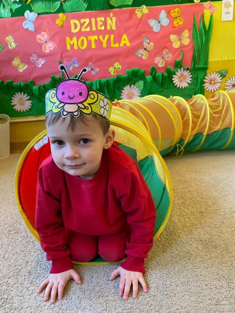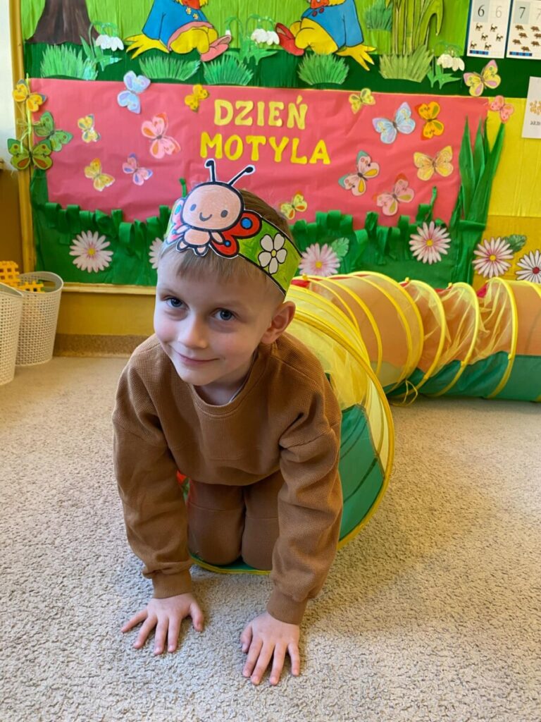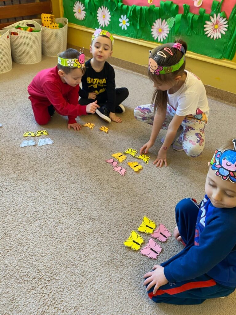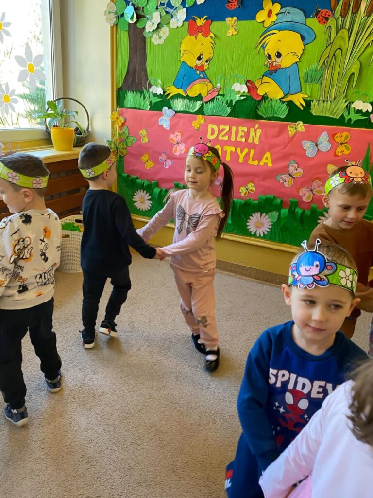 w grupie „Słoneczka”- Fruwający kwiatuszek, który pląsa po łące jak duszek. Motyle są zachwycające i niezwykle pożyteczne. Dzieci poznały cykl życiowy motyla, jego budowę oraz niektóre gatunki i ich rodziny. Zabawa była iście wiosenna 🦋