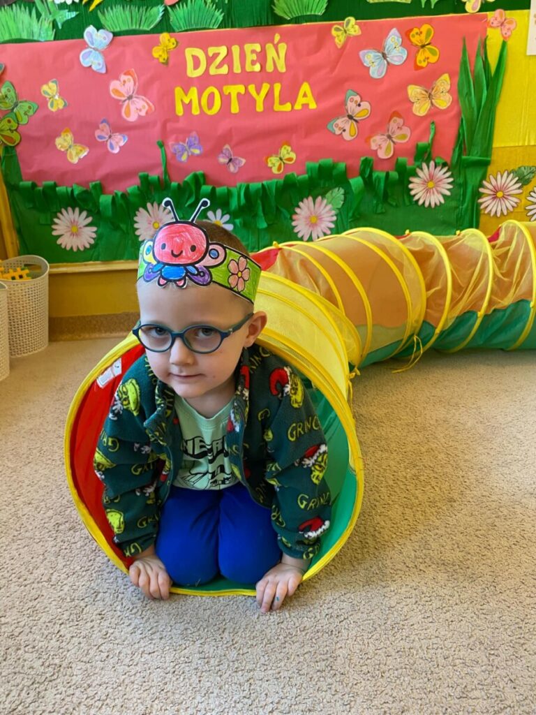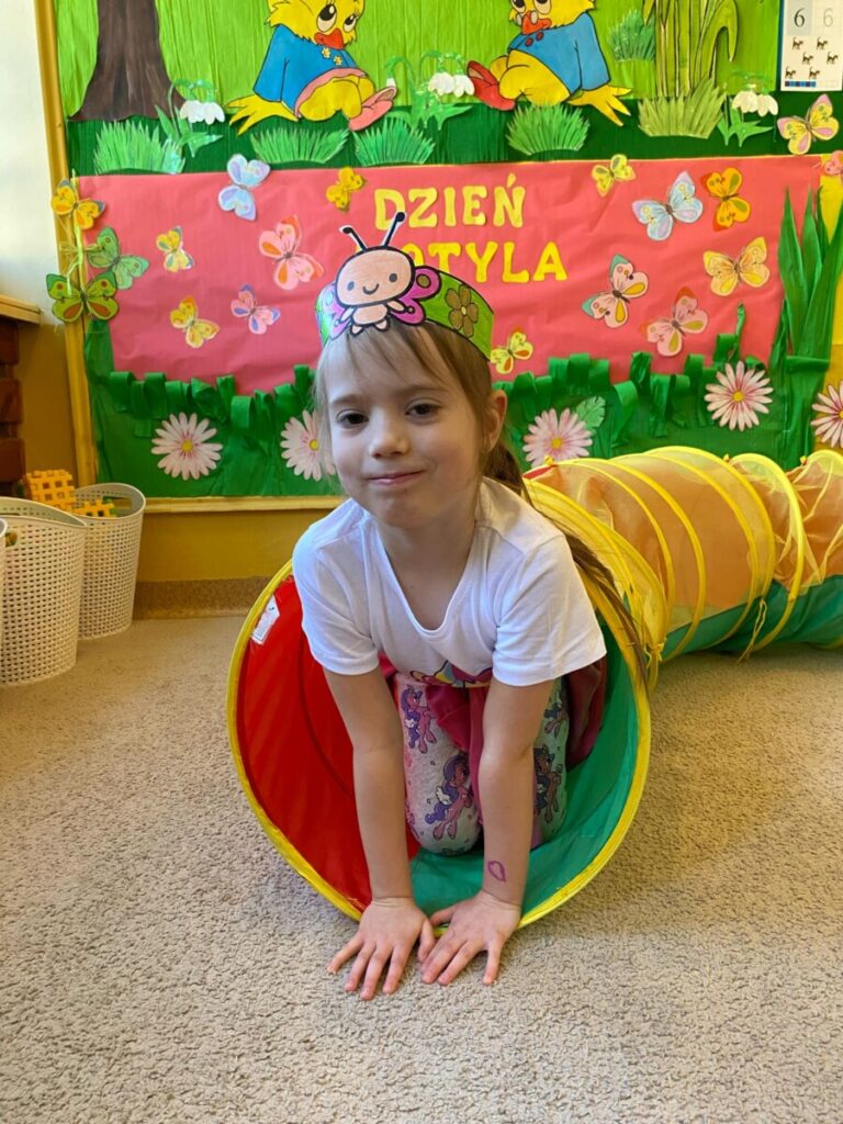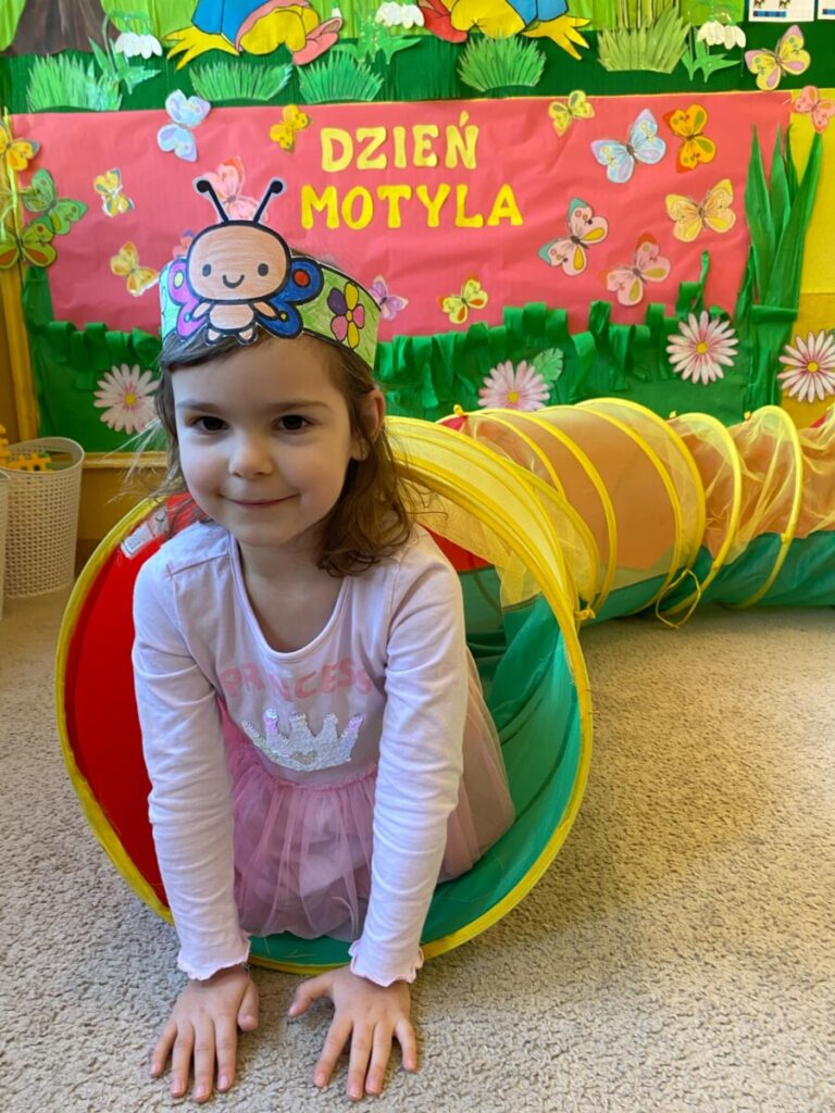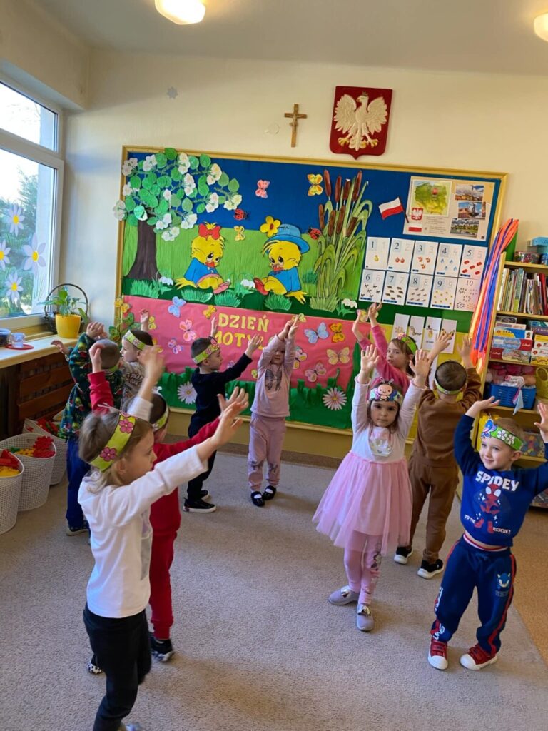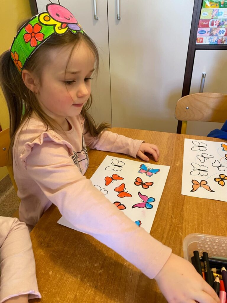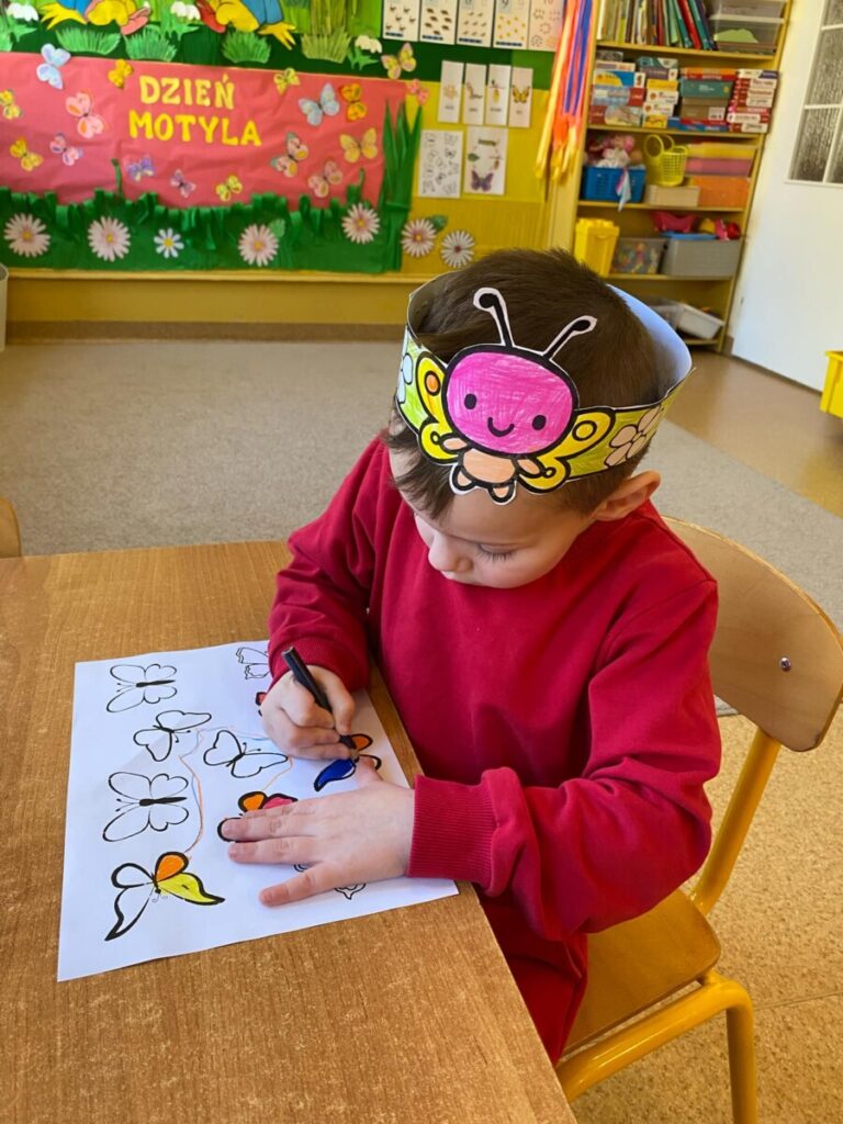 w grupie „Słoneczka”- Fruwający kwiatuszek, który pląsa po łące jak duszek. Motyle są zachwycające i niezwykle pożyteczne. Dzieci poznały cykl życiowy motyla, jego budowę oraz niektóre gatunki i ich rodziny. Zabawa była iście wiosenna 🦋