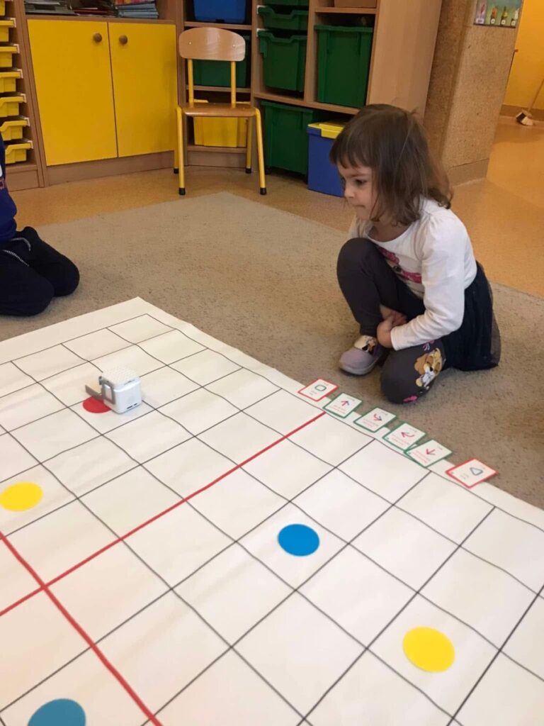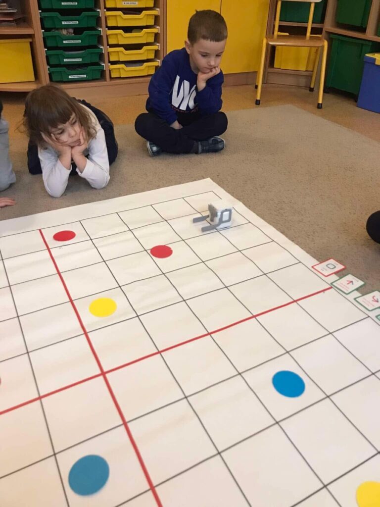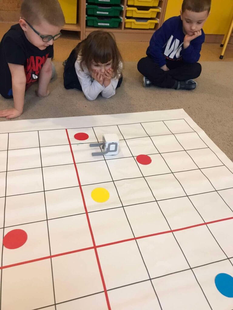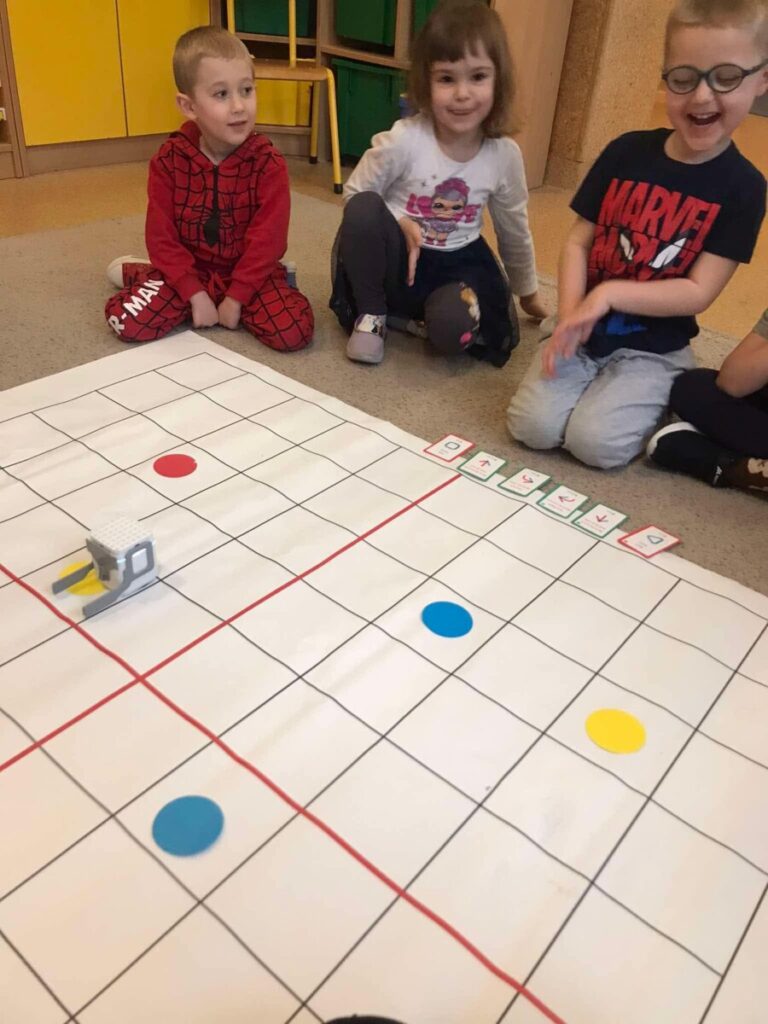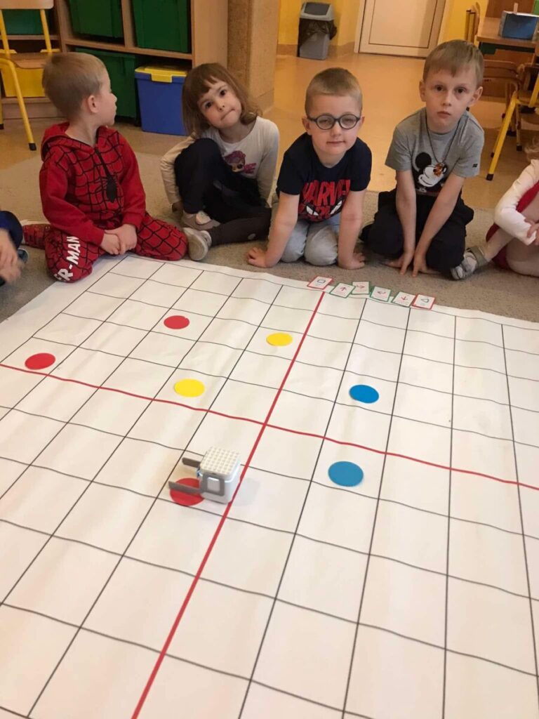 Kodowanie na dywanie z GenitBotem w grupa ,, Słoneczka” czyli rozwijanie umiejętności matematycznych i analitycznych w toku zabawy.