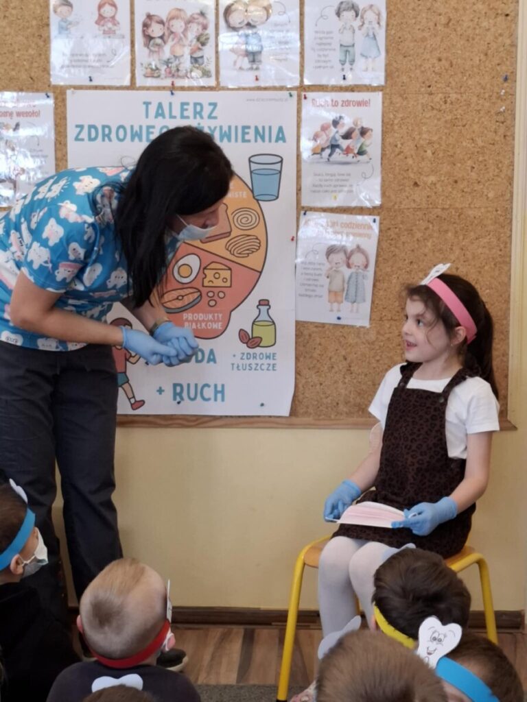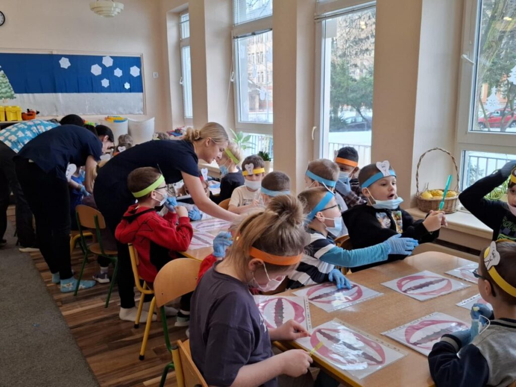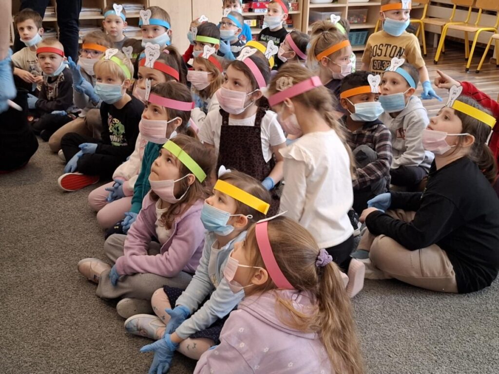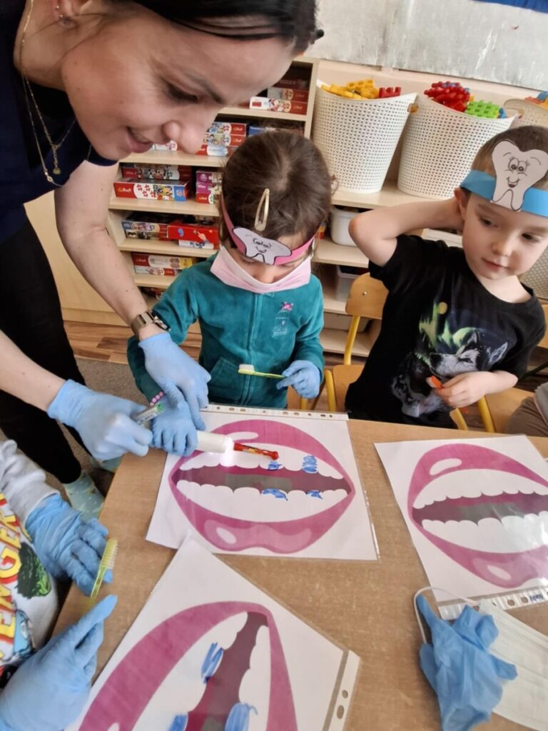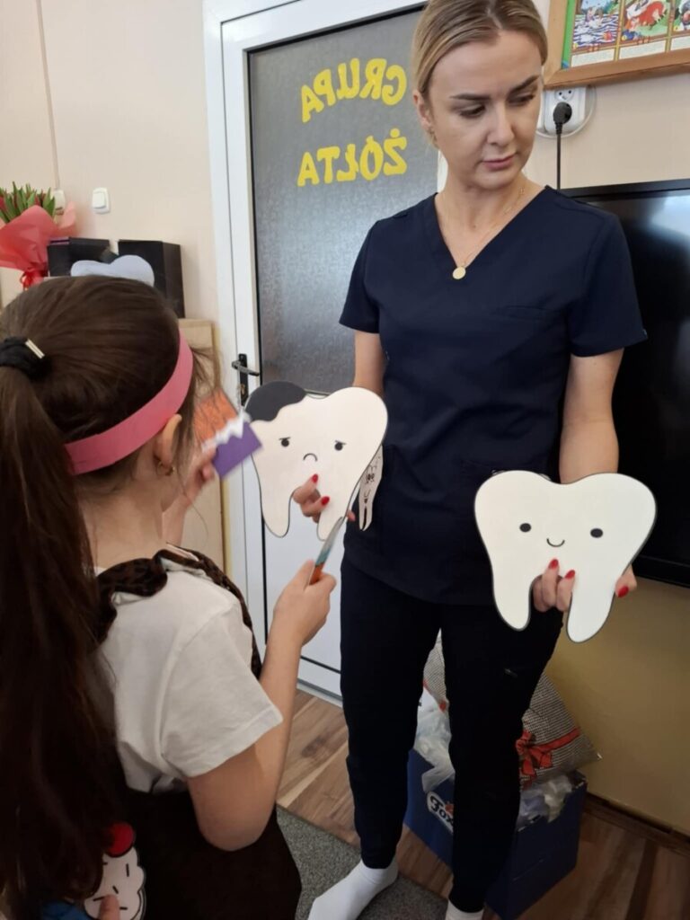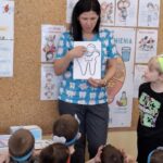 Przedszkolaki z dużym zainteresowaniem brały udział w spotkaniu, chętnie odpowiadały na pytania oraz dzieliły się swoimi doświadczeniami. Największą atrakcją była część praktyczna, podczas której dzieci miały okazję samodzielnie ćwiczyć prawidłowe szczotkowanie zębów.