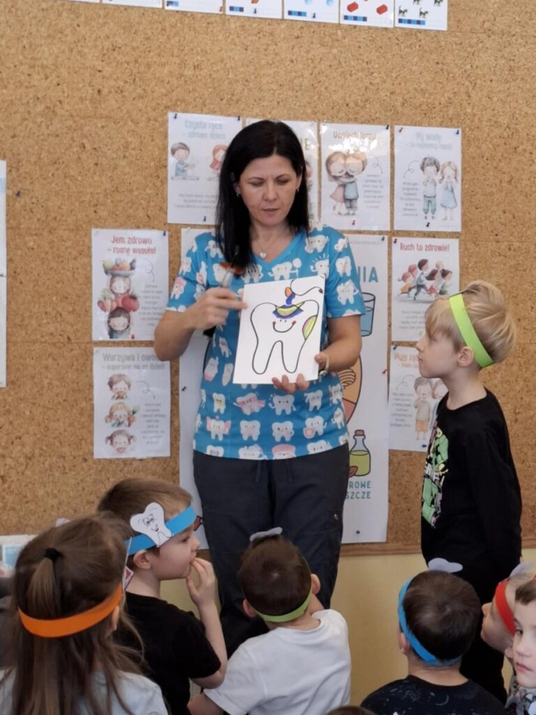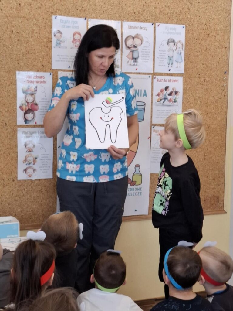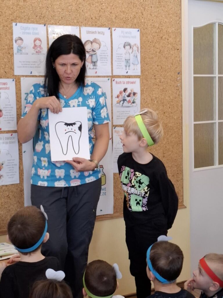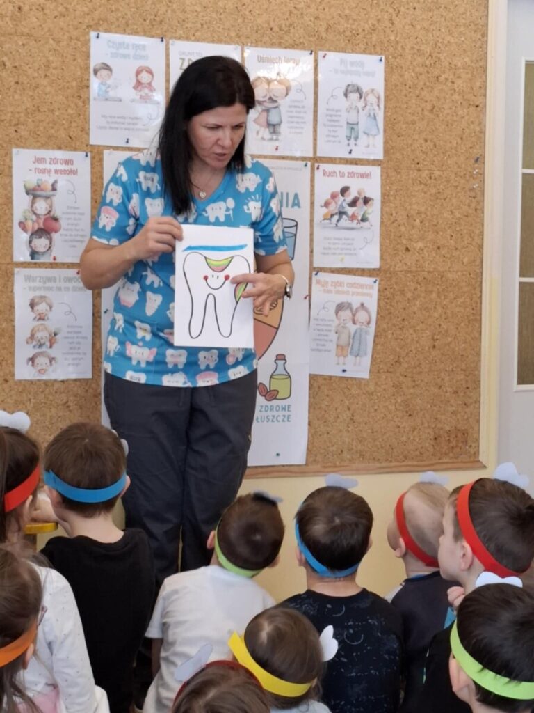 W piątek, 6 lutego, w przedszkolu odbyło się spotkanie z panią stomatolog Barbarą Buszewską, mamą Krzysia. Podczas zajęć dzieci dowiedziały się, jak ważna jest codzienna higiena jamy ustnej oraz dbanie o zdrowy i piękny uśmiech. Pani stomatolog opowiedziała również, jak wygląda wizyta w gabinecie dentystycznym.