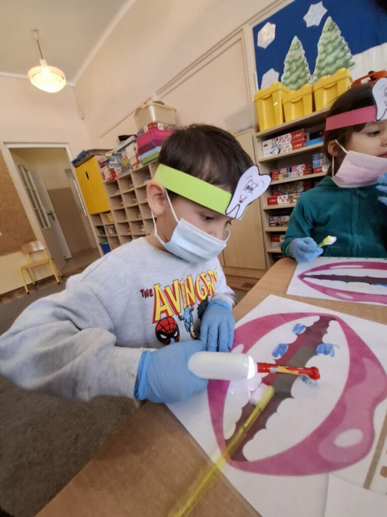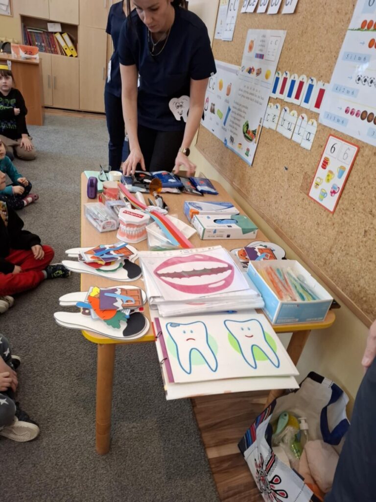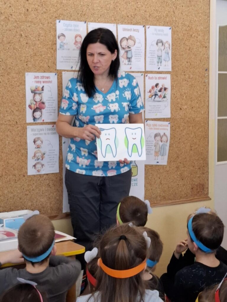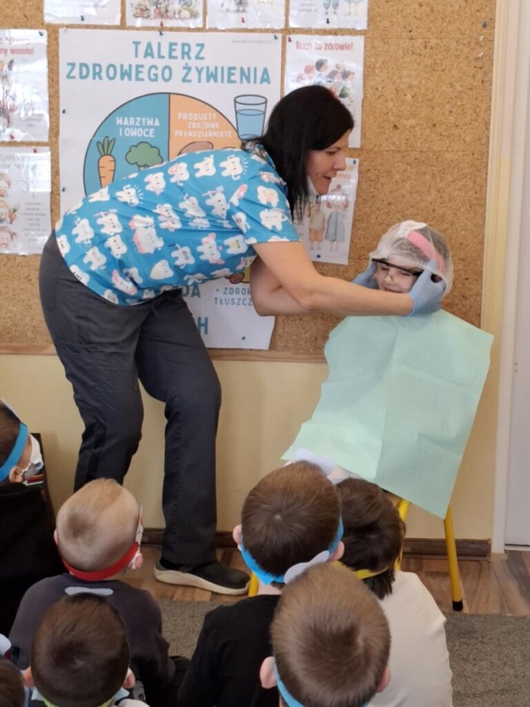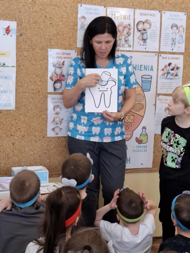 W piątek, 6 lutego, w przedszkolu odbyło się spotkanie z panią stomatolog Barbarą Buszewską, mamą Krzysia. Podczas zajęć dzieci dowiedziały się, jak ważna jest codzienna higiena jamy ustnej oraz dbanie o zdrowy i piękny uśmiech. Pani stomatolog opowiedziała również, jak wygląda wizyta w gabinecie dentystycznym.