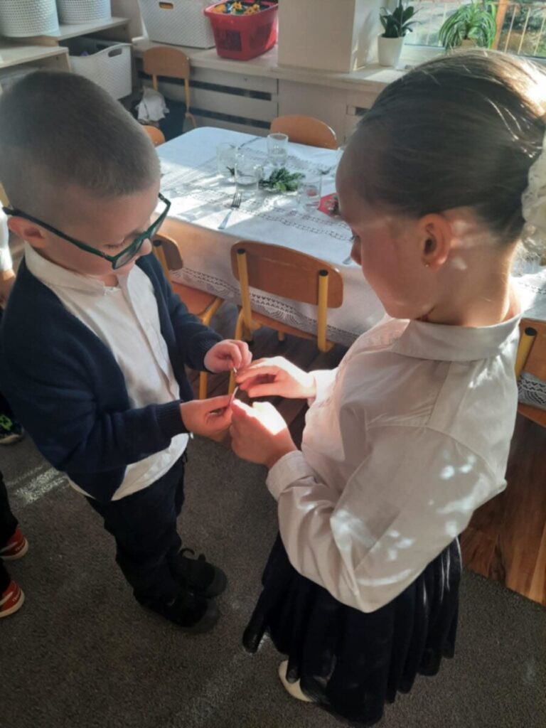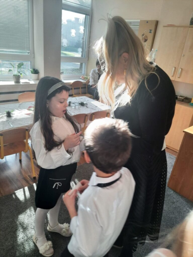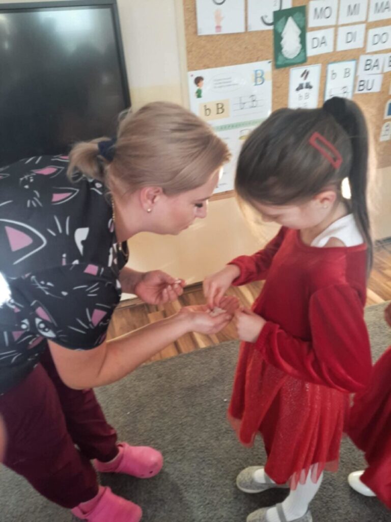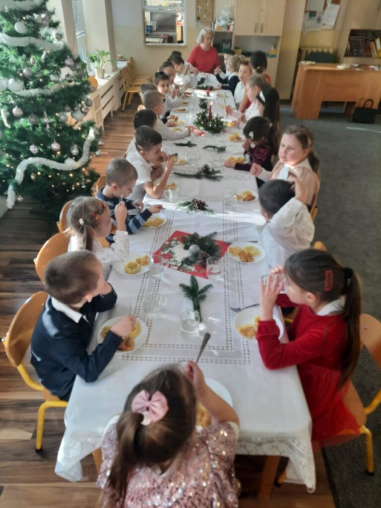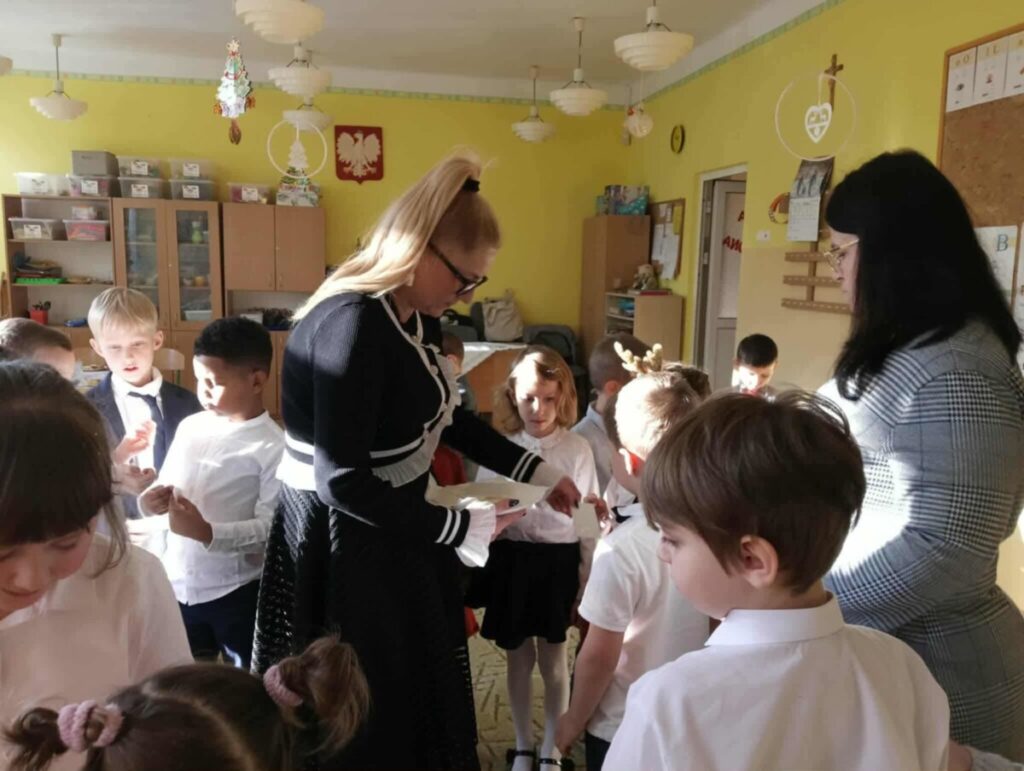 . Pani Dyrektor złożyła wszystkim ciepłe, pełne serdeczności życzenia świąteczne. Następnie wszyscy podzielili się opłatkiem, składając sobie nawzajem życzenia, a wspólne śpiewanie kolęd wprowadziło wyjątkową, bożonarodzeniową atmosferę